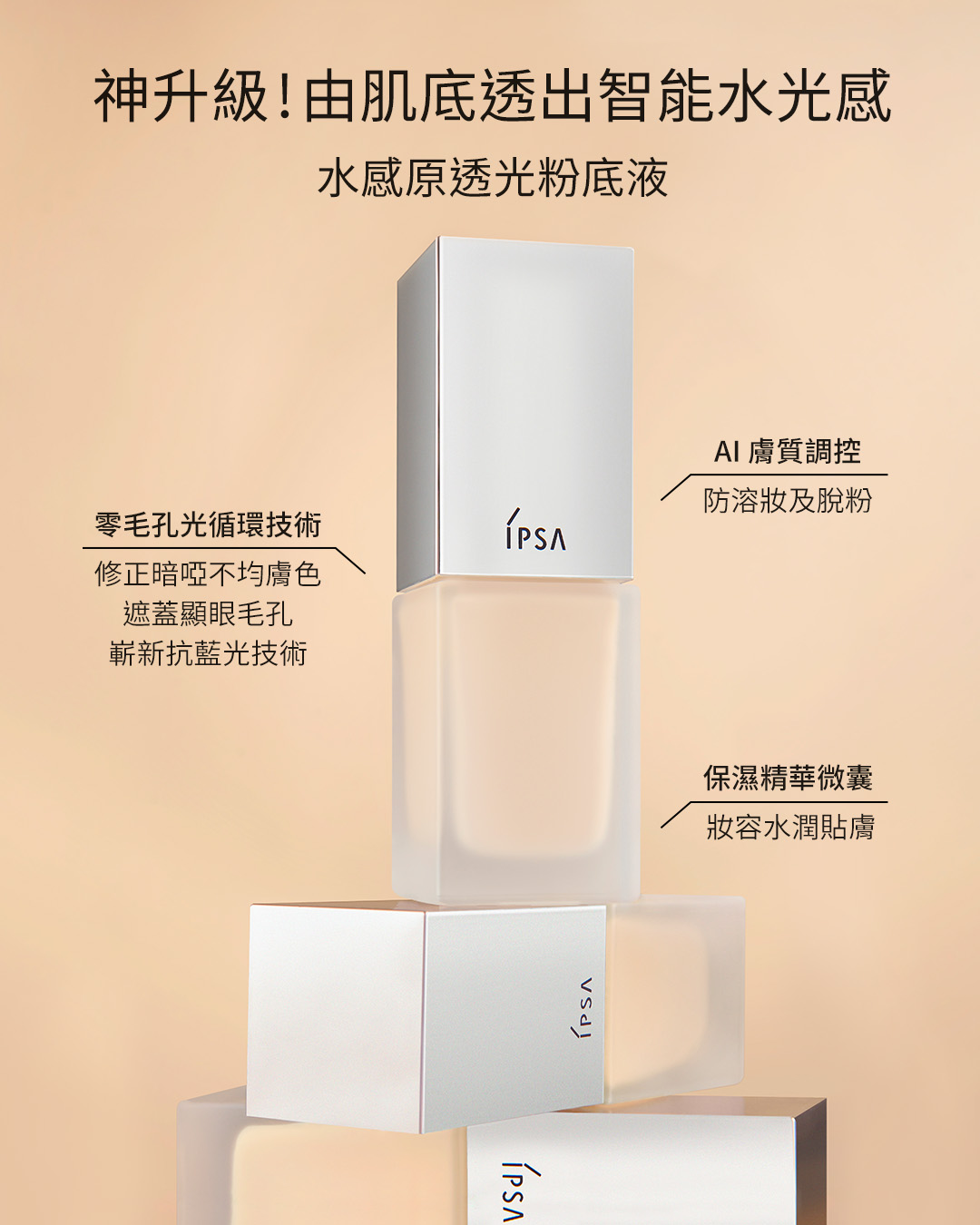 - 可配合IPSA 透光調色底霜及輕柔透亮蜜粉完成底妝,塑造水感透光肌
