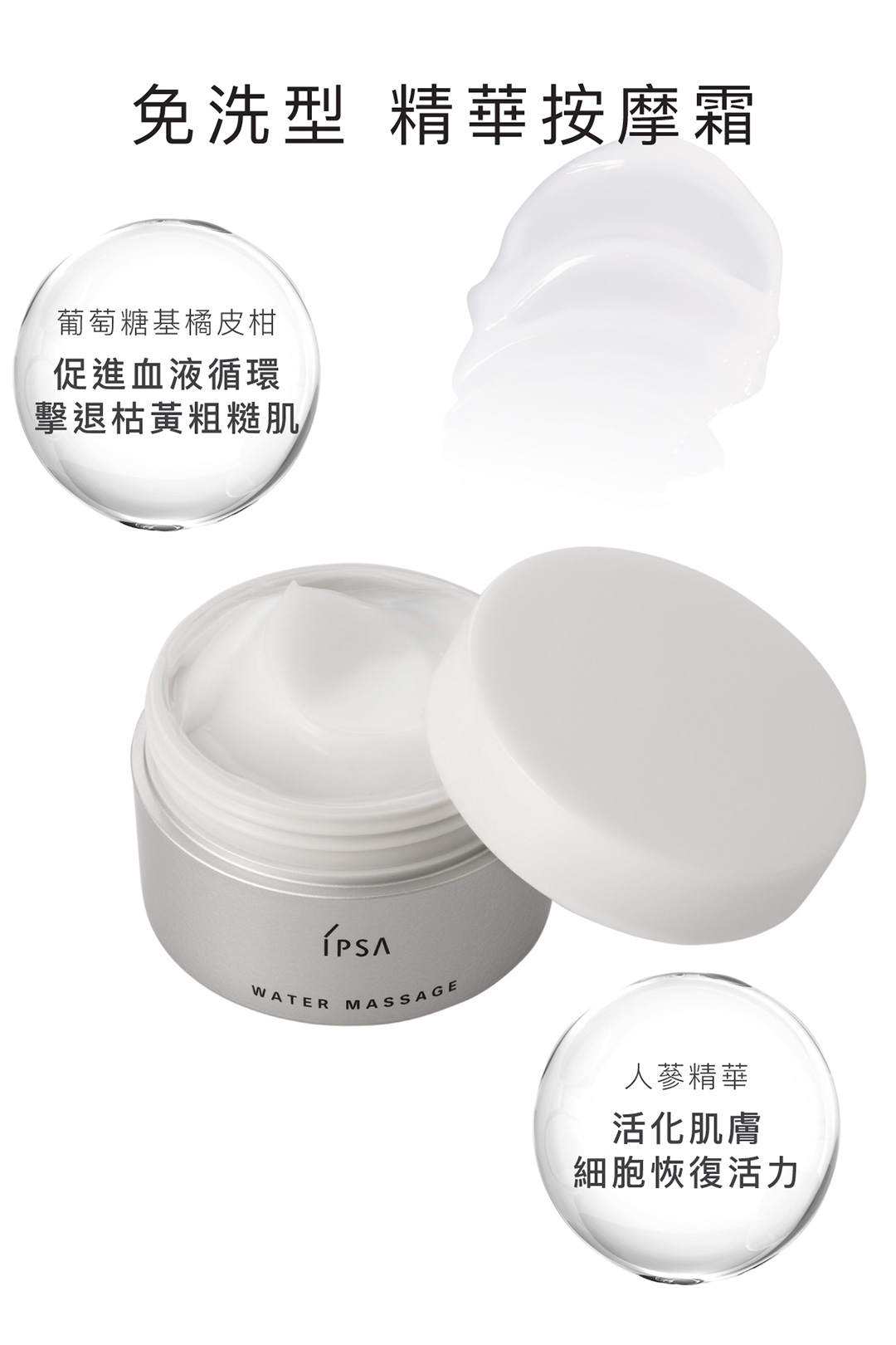 免洗型精華按摩霜,蘊含葡萄糖基橘皮柑及珍貴人蔘精華成份,配合按摩將美容成分速效滲入肌膚活躍細胞,帶動血液循環,擊退枯黃粗糙,瞬間光澤飽滿。