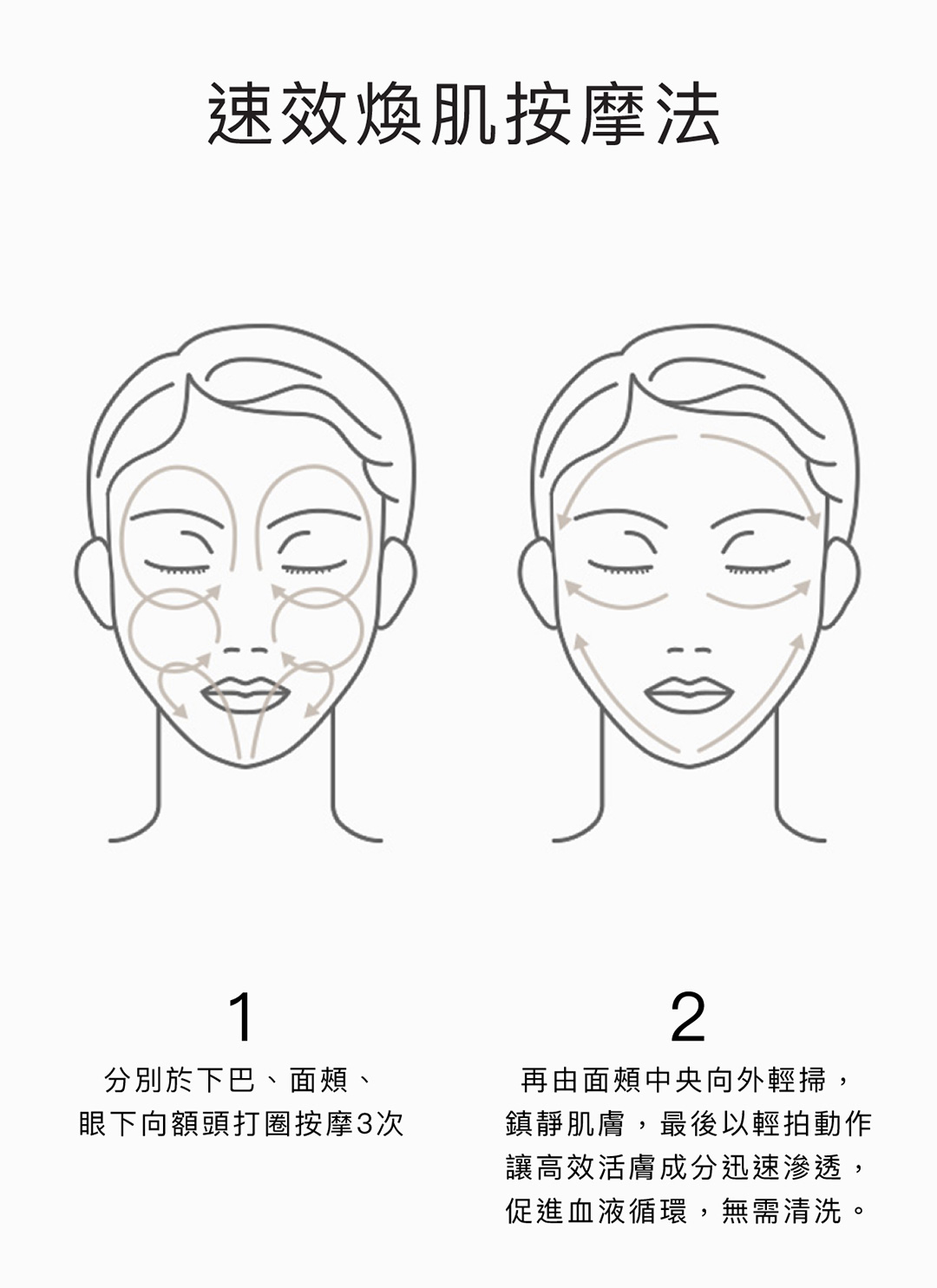 速效煥肌按摩法:分別於下巴、面頰、眼下向額頭打圈按摩3次再由面頰中央向外輕掃,鎮靜肌膚,最後以輕拍動作讓高效活膚成分迅速滲透,促進血液循環,無需清洗。