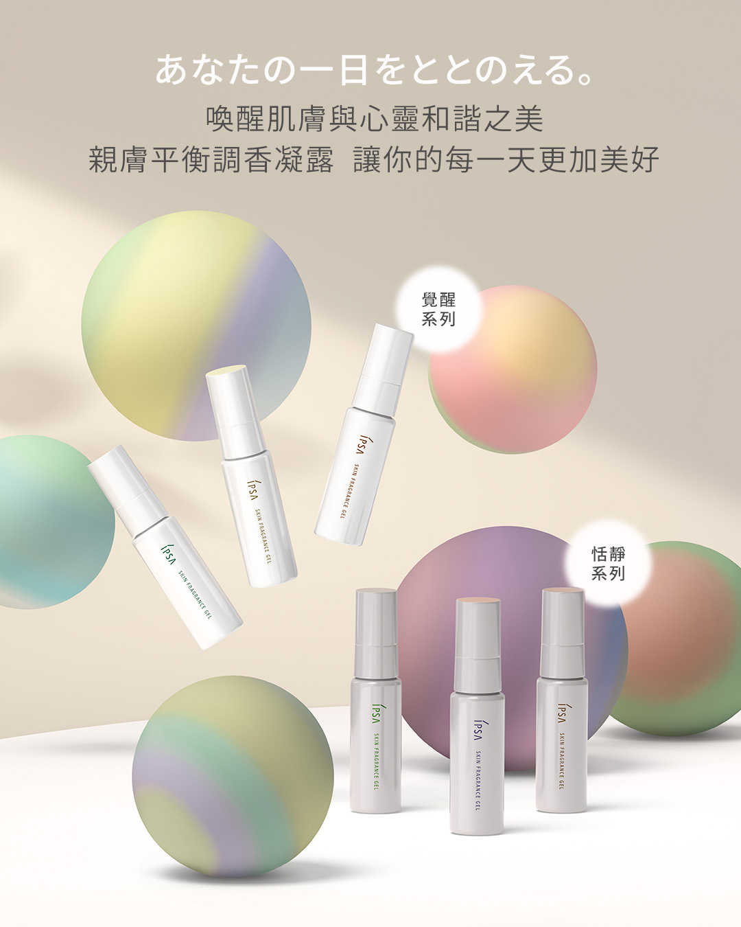 產品包裝上的色彩象徵著香氣成分,這些「香氛球」幫助具象化香氣與產品概念。產品與香氛球之間的互動暗示著每一項商品皆擁有獨特的香氣。「覺醒系列」如同在空中飄浮,充滿活力,而 「恬靜系列」則靜靜地擺放在桌上。背景如同日常生活的場景,傳達出產品與每個人生活方式的和諧融合。