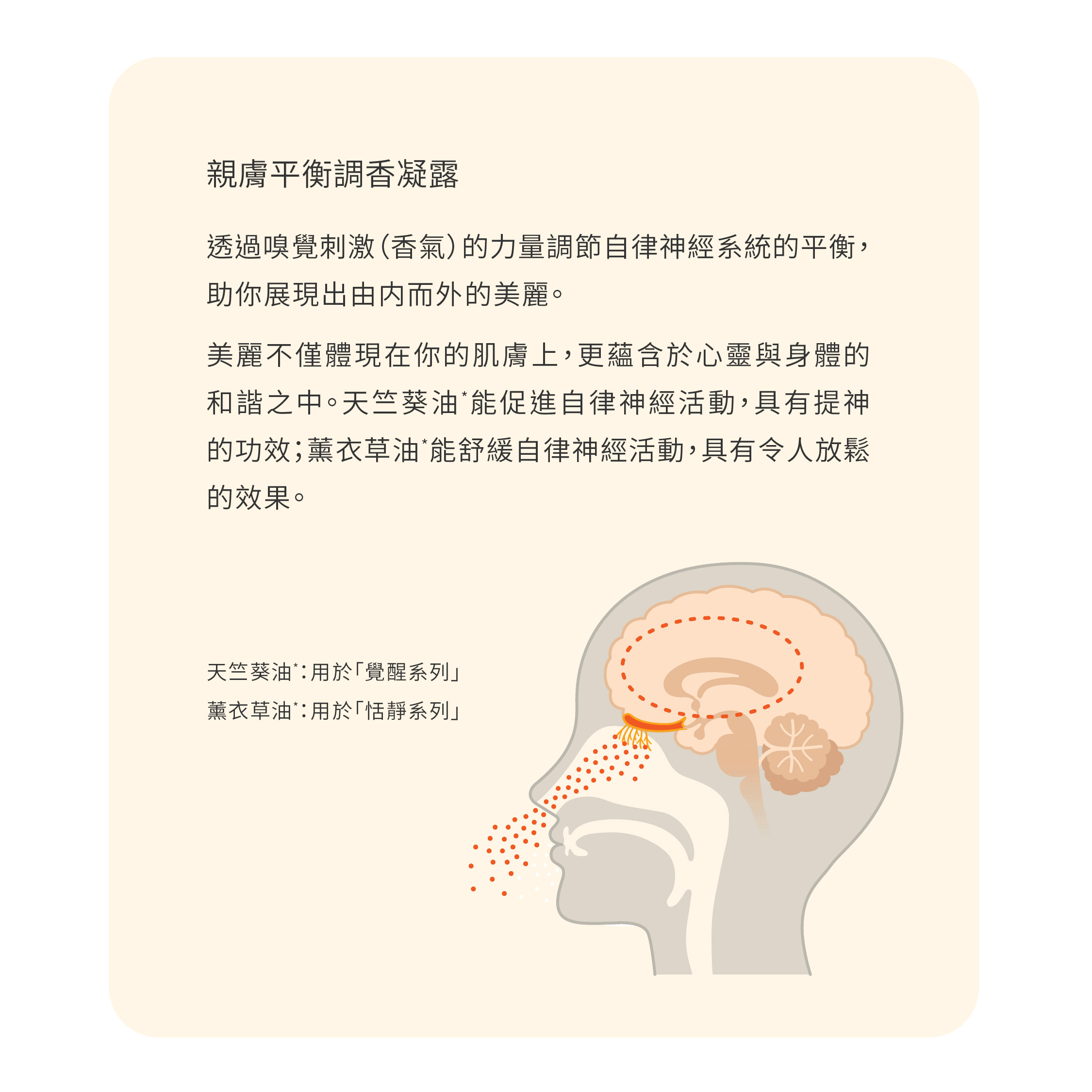 親膚平衡調香凝露能助你專注於自己,當希望讓自己煥然一新時,如工作或學習前使用,能令你感覺神清氣爽和積極;當希望放鬆自己時,在獨處時間使用,能讓你感受平靜祥和。