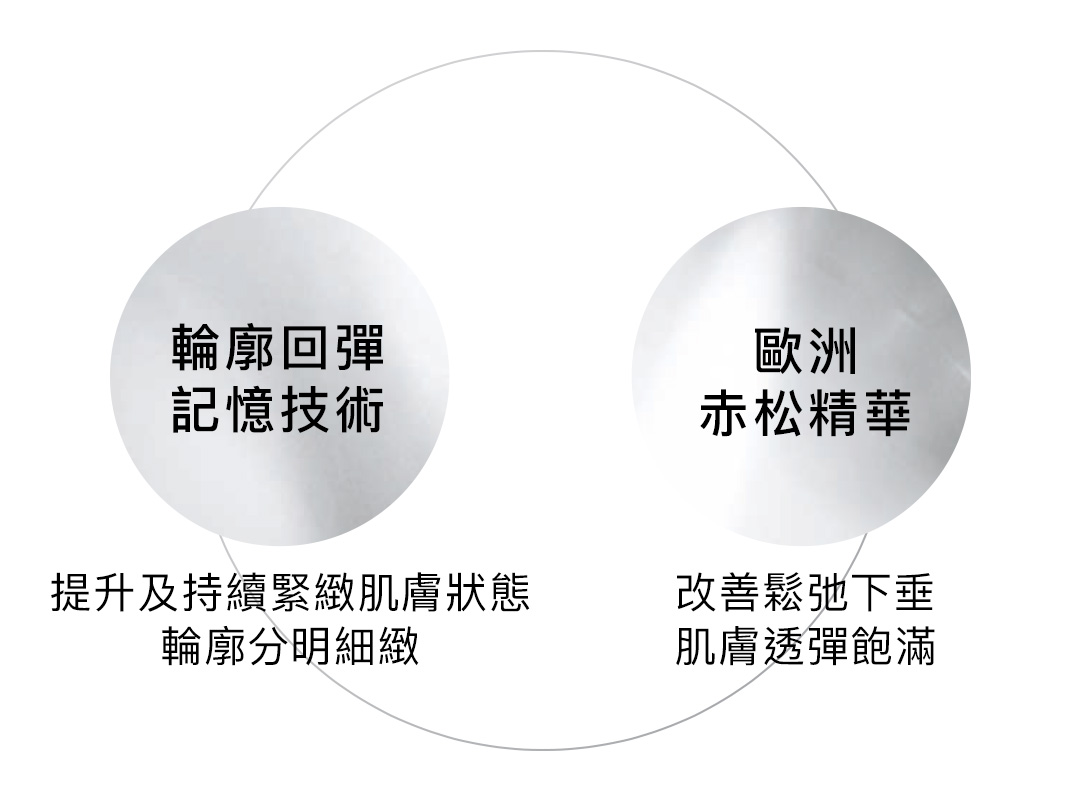 - 歐洲赤松提拉萃取:從200種植物中精選出歐洲赤松提拉萃取,改善鬆弛下垂,回復年輕緊緻透彈肌