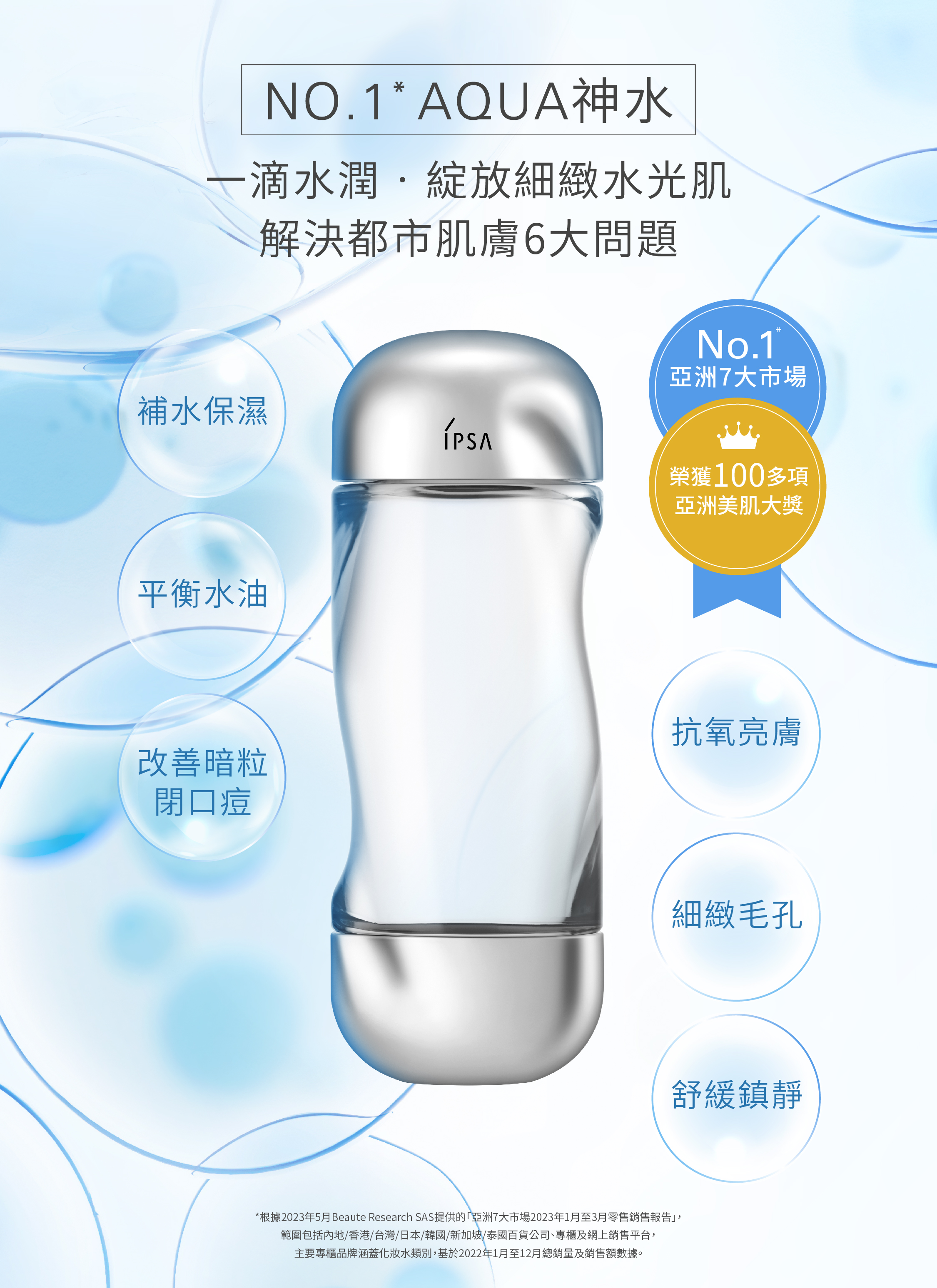 IPSA深信萬物水造,流水所至,肌膚水循環即被喚醒。皇牌No. 1 AQUA神水* 蘊含超微細保濕分子,一滴水潤,無間斷補水、鎖水、造水 。針對解決都市6大肌膚不問題,如:乾燥缺水、粗大毛孔、暗粒閉口痘、氧化暗沉、粗糙、泛紅,綻放神級透亮光澤。